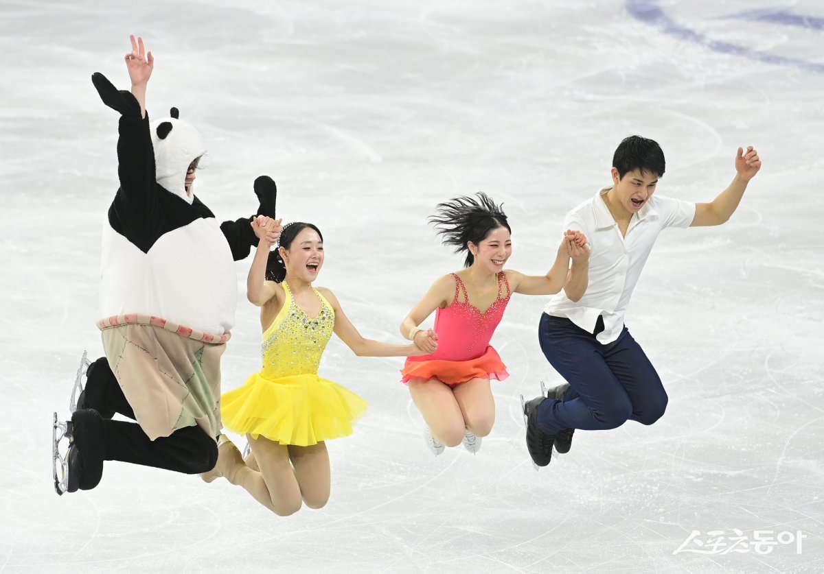 왼쪽부터 남자 싱글 카자흐스탄 미하일 샤이도로프, 여자 싱글 대한민국 김채연, 페어 부문 일본 미우라 리쿠, 키하라 류이치가 23일 서울 목동종합운동장 목동아이스링크에서 열린 ‘4대륙 피겨스케이팅 선수권대회’ 갈라쇼를 마친 후 기념 촬영을 하고 있다. 목동 | 주현희 기자 teth1147@donga.com