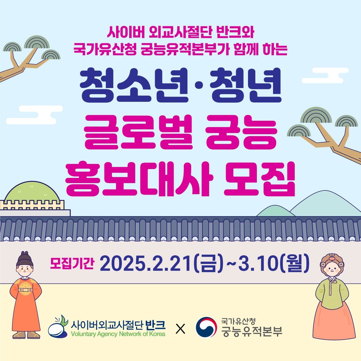 사이버외교사절단 반크는 국가유산청 궁능유적본부와 협력하여 청소년과 청년들을 대상으로 ‘글로벌 궁능 홍보대사’ 양성 프로젝트를 진행한다.