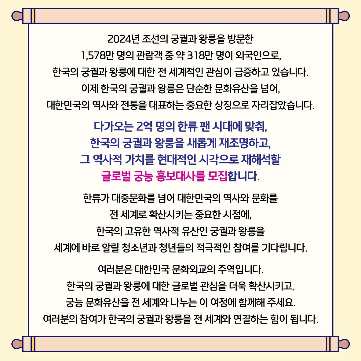 이번 홍보대사 모집은 한류가 대중문화를 넘어 대한민국의 역사와 문화를 전 세계로 확산시키는 중요한 시점에 이루어지는 만큼, 한국의 고유한 역사적 유산인 궁궐과 왕릉을 세계에 알릴 청소년과 청년들의 적극적인 참여가 기대된다.