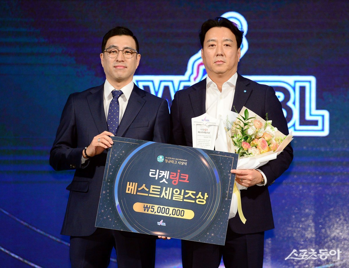 24일 서울 드래곤시티호텔에서 ‘하나은행 2024-2025 여자프로농구 정규리그 시상식’이 열렸다. 티켓링크 베스트세일즈상을 수상한 우리은행 정장훈 사무국장(오른쪽)이 티켓링크 유현종 스포츠사업실장과기념촬영을 하고 있다. 김민성 기자 marineboy@donga.com