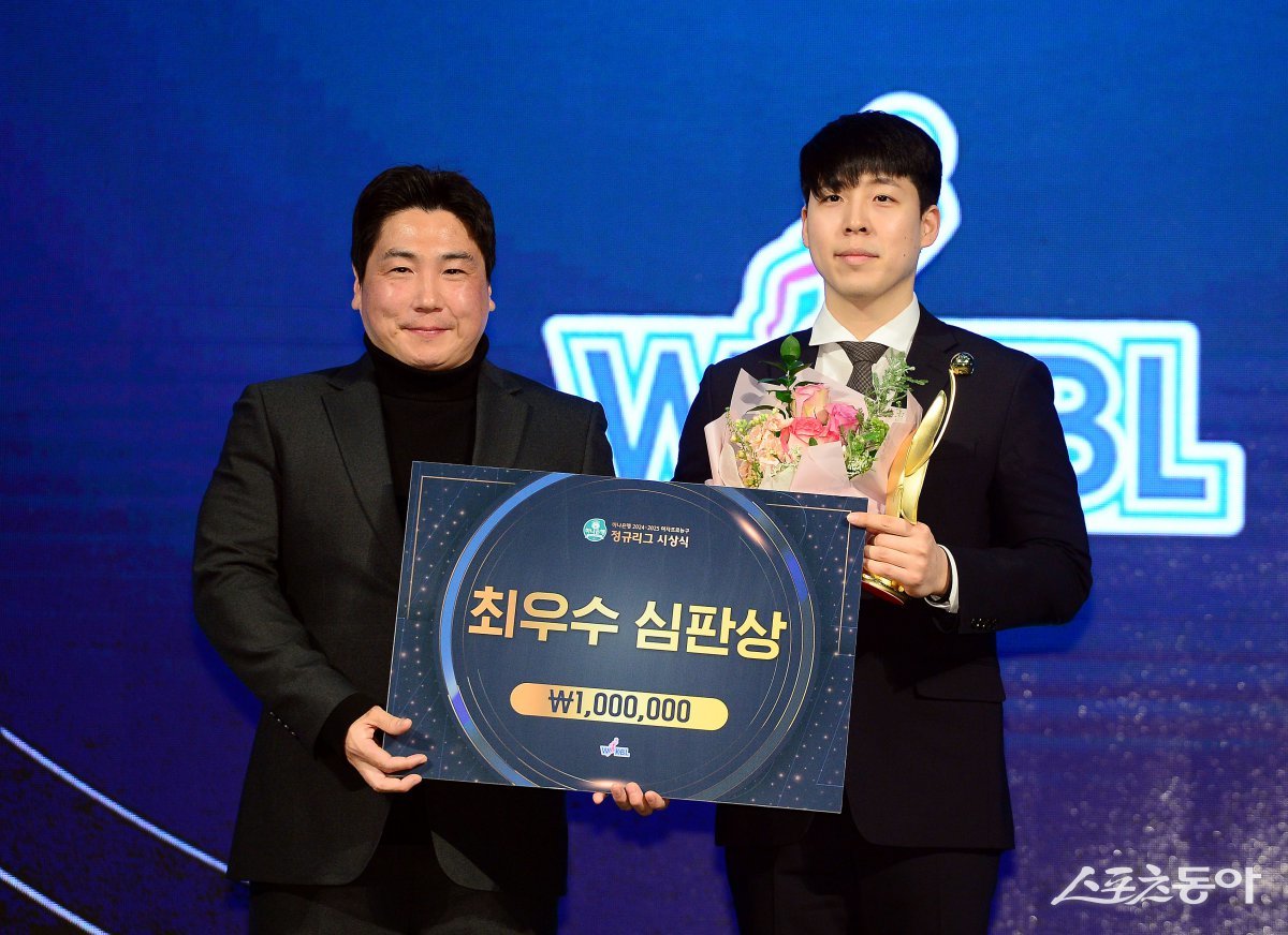 24일 서울 드래곤시티호텔에서 ‘하나은행 2024-2025 여자프로농구 정규리그 시상식’이 열렸다. 최우수 심판상을 수상한 신형 심판이 한소레미콘 김정욱 대표이사와 기념촬영을 하고 있다. 김민성 기자 marineboy@donga.com