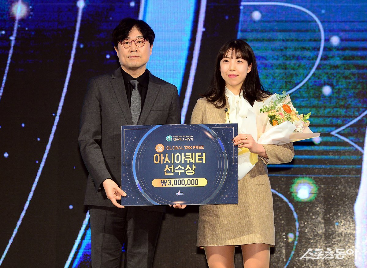 24일 서울 드래곤시티호텔에서 ‘하나은행 2024-2025 여자프로농구 정규리그 시상식’이 열렸다. GTF 아시아쿼터선수상을 수상한 KB 나가타 모에가 한국대학농구연맹 김양구 회장과 기념촬영을 하고 있다. 김민성 기자 marineboy@donga.com