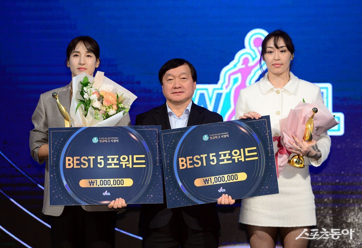 24일 서울 드래곤시티호텔에서 ‘하나은행 2024-2025 여자프로농구 정규리그 시상식’이 열렸다. BEST 5 포워드에 선정된 우리은행 김단비와 BNK 김소니아가 KBS N 이강덕 대표이사와 기념촬영을 하고 있다. 김민성 기자 marineboy@donga.com