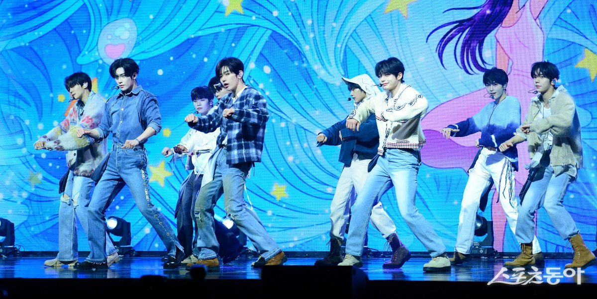 그룹 제로베이스원(ZEROBASEONE)이 24일 서울 용산구 블루스퀘어에서 열린 미니 5집 ‘블루 파라다이스’(BLUE PARADISE) 발매 쇼케이스에서 화려한 무대를 펼치고 있다. 김종원 기자 won@donga.com