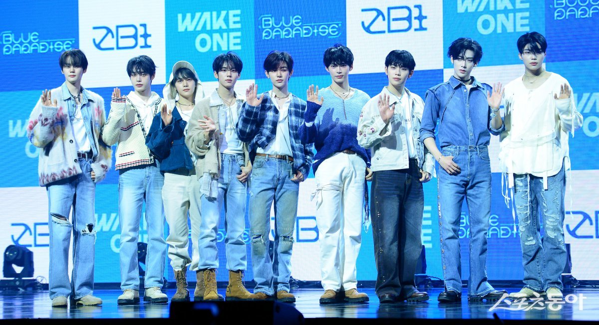 그룹 제로베이스원(ZEROBASEONE)이 24일 서울 용산구 블루스퀘어에서 열린 미니 5집 ‘블루 파라다이스’(BLUE PARADISE) 발매 쇼케이스에서 포토타임을 갖고 있다. 김종원 기자 won@donga.com