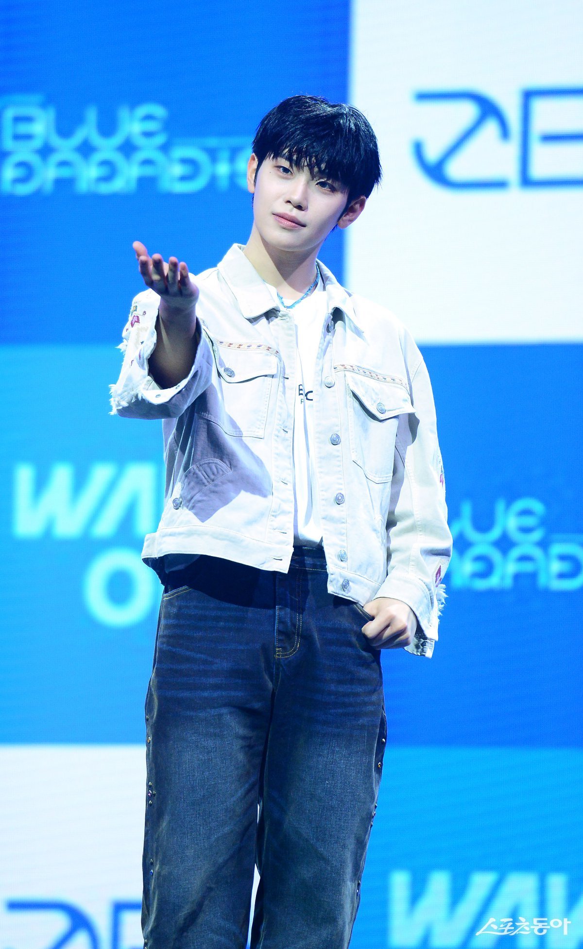 그룹 제로베이스원(ZEROBASEONE) 김태래가 24일 서울 용산구 블루스퀘어에서 열린 미니 5집 ‘블루 파라다이스’(BLUE PARADISE) 발매 쇼케이스에서 포토타임을 갖고 있다. 김종원 기자 won@donga.com