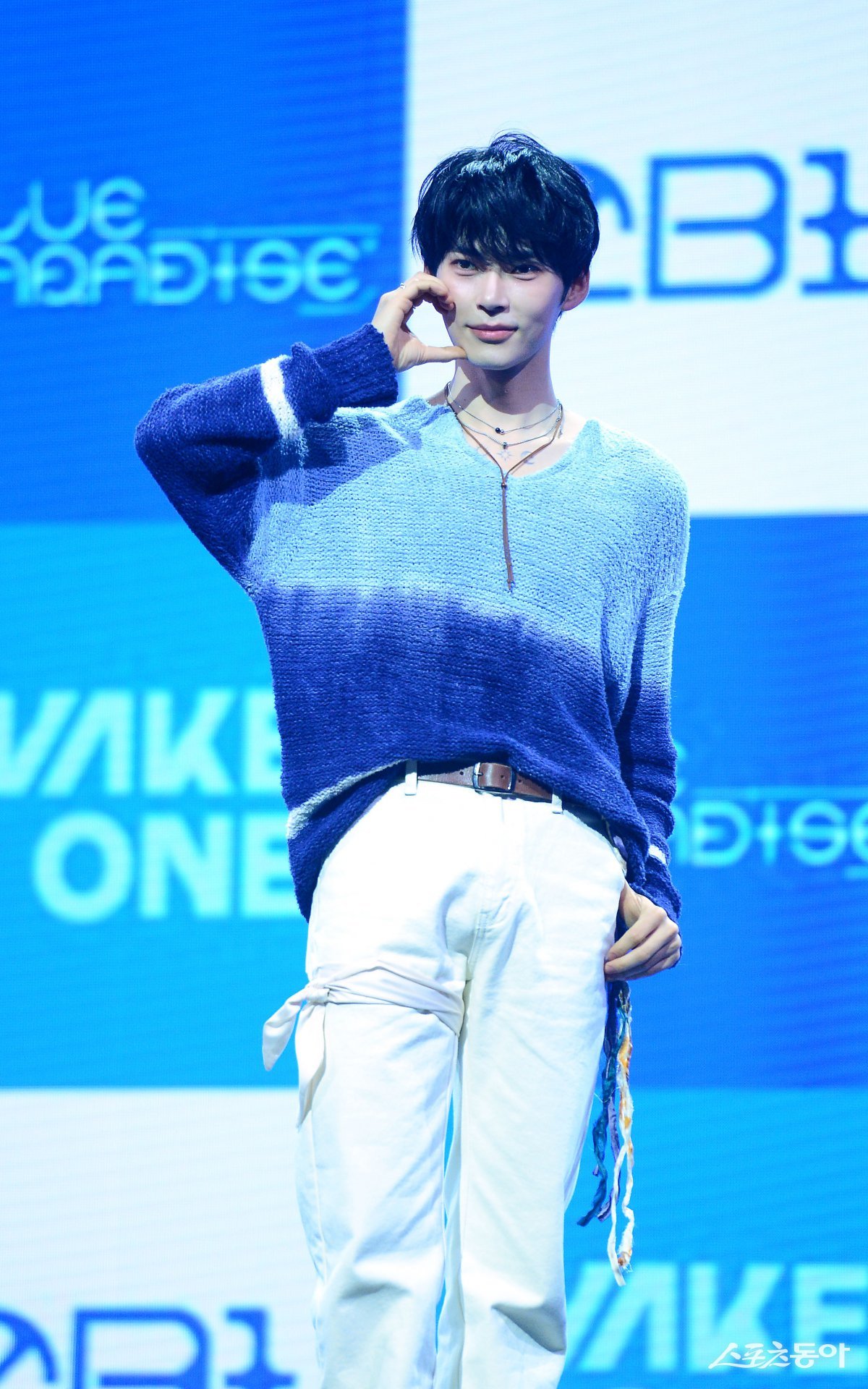 그룹 제로베이스원(ZEROBASEONE) 성한빈이 24일 서울 용산구 블루스퀘어에서 열린 미니 5집 ‘블루 파라다이스’(BLUE PARADISE) 발매 쇼케이스에서 포토타임을 갖고 있다. 김종원 기자 won@donga.com