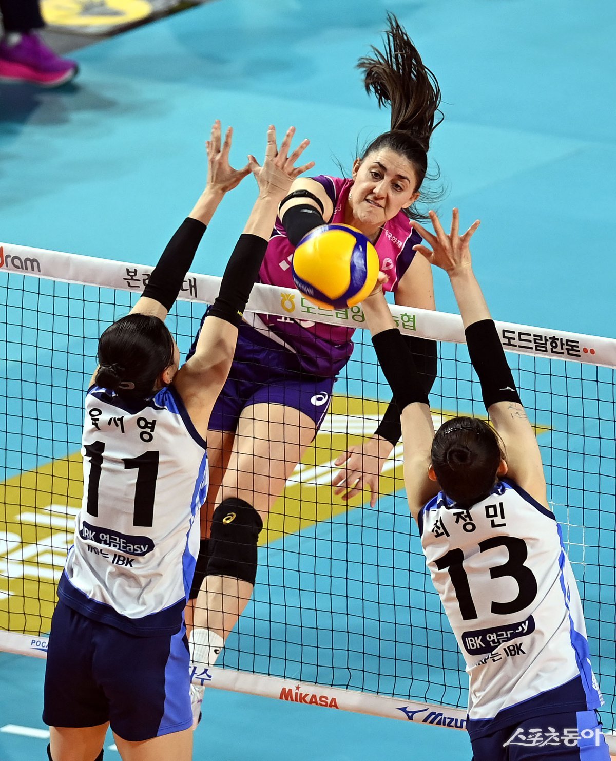 25일 인천 삼산월드체육관에서 ‘도드람 2024-2025 V리그’ 흥국생명과 IBK기업은행의 여자부 경기가 열렸다. 흥국생명 피치가 IBK기업은행 블로커를 피해 스파이크를 날리고 있다. 인천 | 김민성 기자 marineboy@donga.com