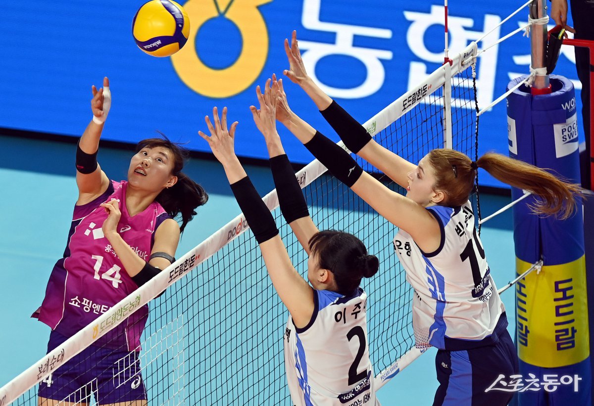 25일 인천 삼산월드체육관에서 ‘도드람 2024-2025 V리그’ 흥국생명과 IBK기업은행의 여자부 경기가 열렸다. 흥국생명 정윤주가 IBK기업은행 블로커를 피해 스파이크를 날리고 있다. 인천 | 김민성 기자 marineboy@donga.com