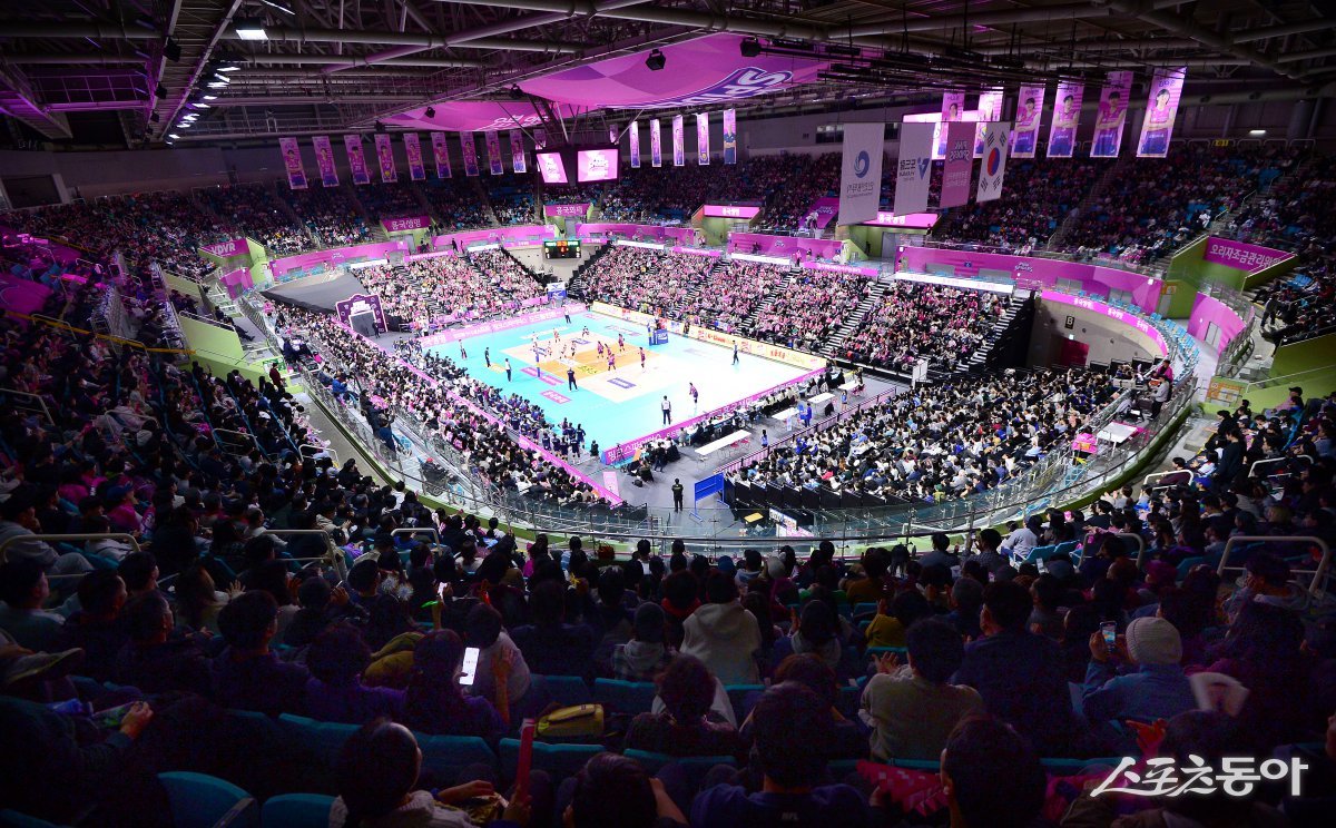 25일 인천 삼산월드체육관에서 ‘도드람 2024-2025 V리그’ 흥국생명과 IBK기업은행의 여자부 경기가 열렸다. 경기장을 가득메운 배구팬들이 응원을 펼치고 있다. 인천 | 김민성 기자 marineboy@donga.com