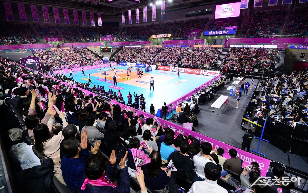 25일 인천 삼산월드체육관에서 ‘도드람 2024-2025 V리그’ 흥국생명과 IBK기업은행의 여자부 경기가 열렸다. 경기장을 가득메운 배구팬들이 응원을 펼치고 있다. 인천 | 김민성 기자 marineboy@donga.com