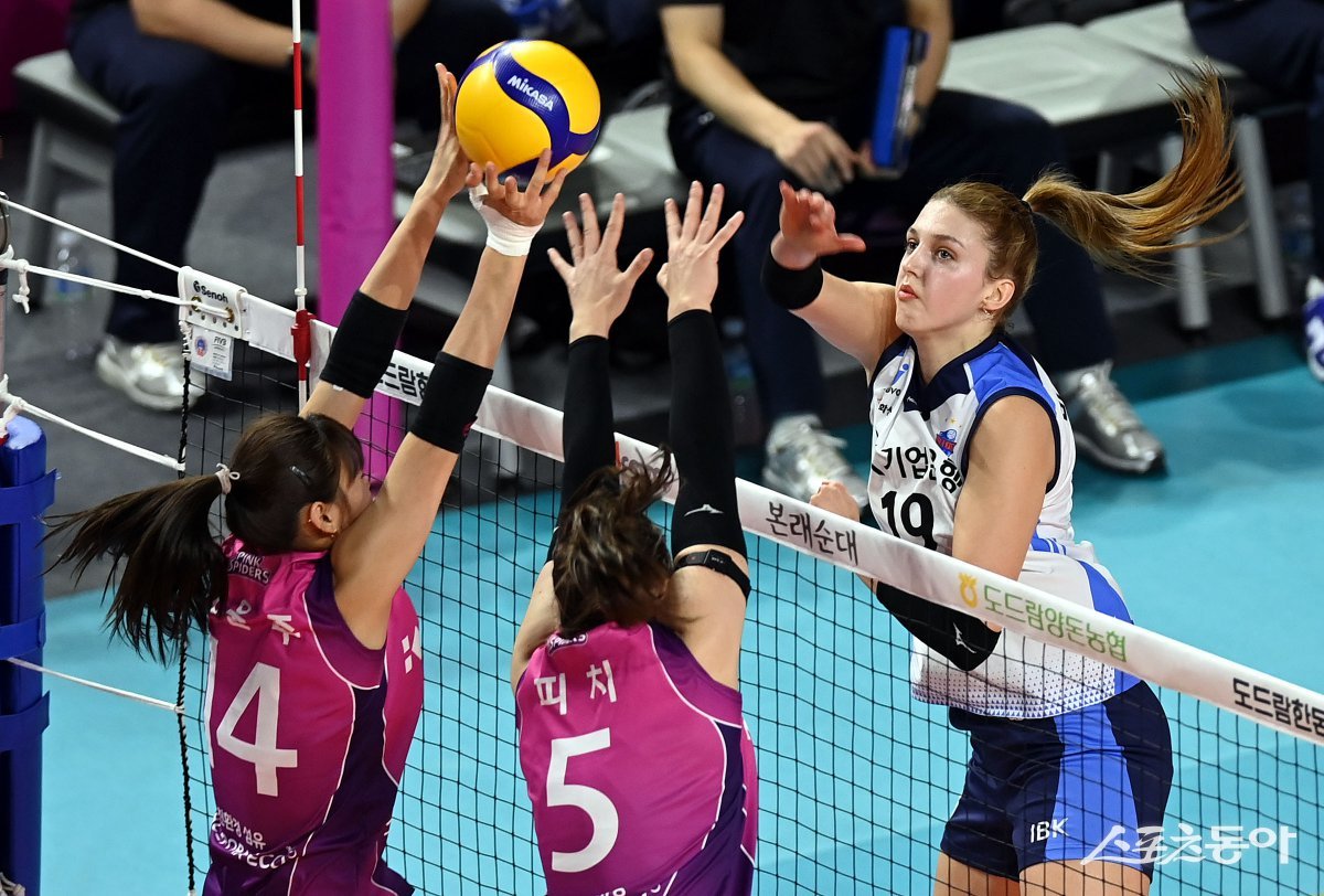 25일 인천 삼산월드체육관에서 ‘도드람 2024-2025 V리그’ 흥국생명과 IBK기업은행의 여자부 경기가 열렸다. IBK기업은행 빅토리아가 흥국생명 블로커를 피해 스파이크를 날리고 있다. 인천 | 김민성 기자 marineboy@donga.com