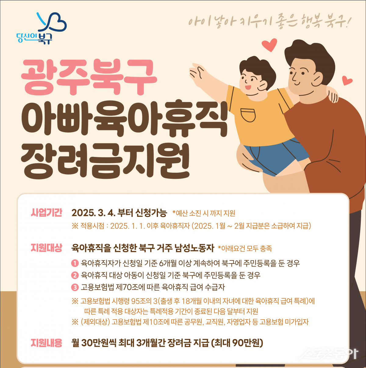 이번 사업의 지원 대상은 고용보험법에 따른 육아휴직 급여를 받으며 2025년 1월 1일 이후 육아휴직 중인 남성 노동자로 장려금 지원 신청일 기준 6개월 이상 연속하여 북구에 주민등록을 두고 있어야 하고 대상 아동 또한 북구 주민이어야 한다.