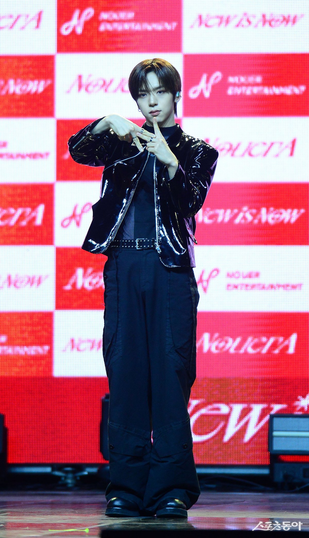 그룹 누에라(NouerA) 현준이 26일 서울 용산구 블루스퀘어에서 열린 첫 미니앨범 ‘Chapter: New is Now’ 발매 쇼케이스에서 포토타임을 갖고 있다. 김종원 기자 won@donga.com