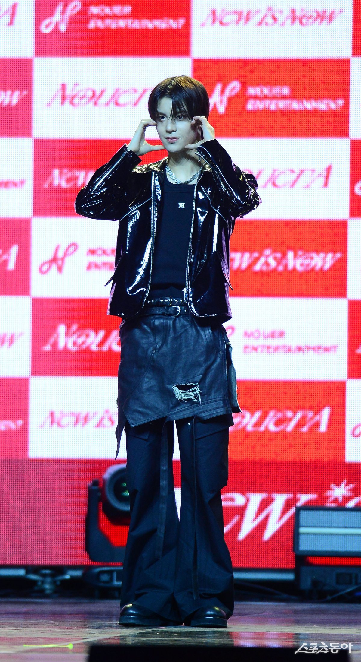 그룹 누에라(NouerA) 판이 26일 서울 용산구 블루스퀘어에서 열린 첫 미니앨범 ‘Chapter: New is Now’ 발매 쇼케이스에서 포토타임을 갖고 있다. 김종원 기자 won@donga.com