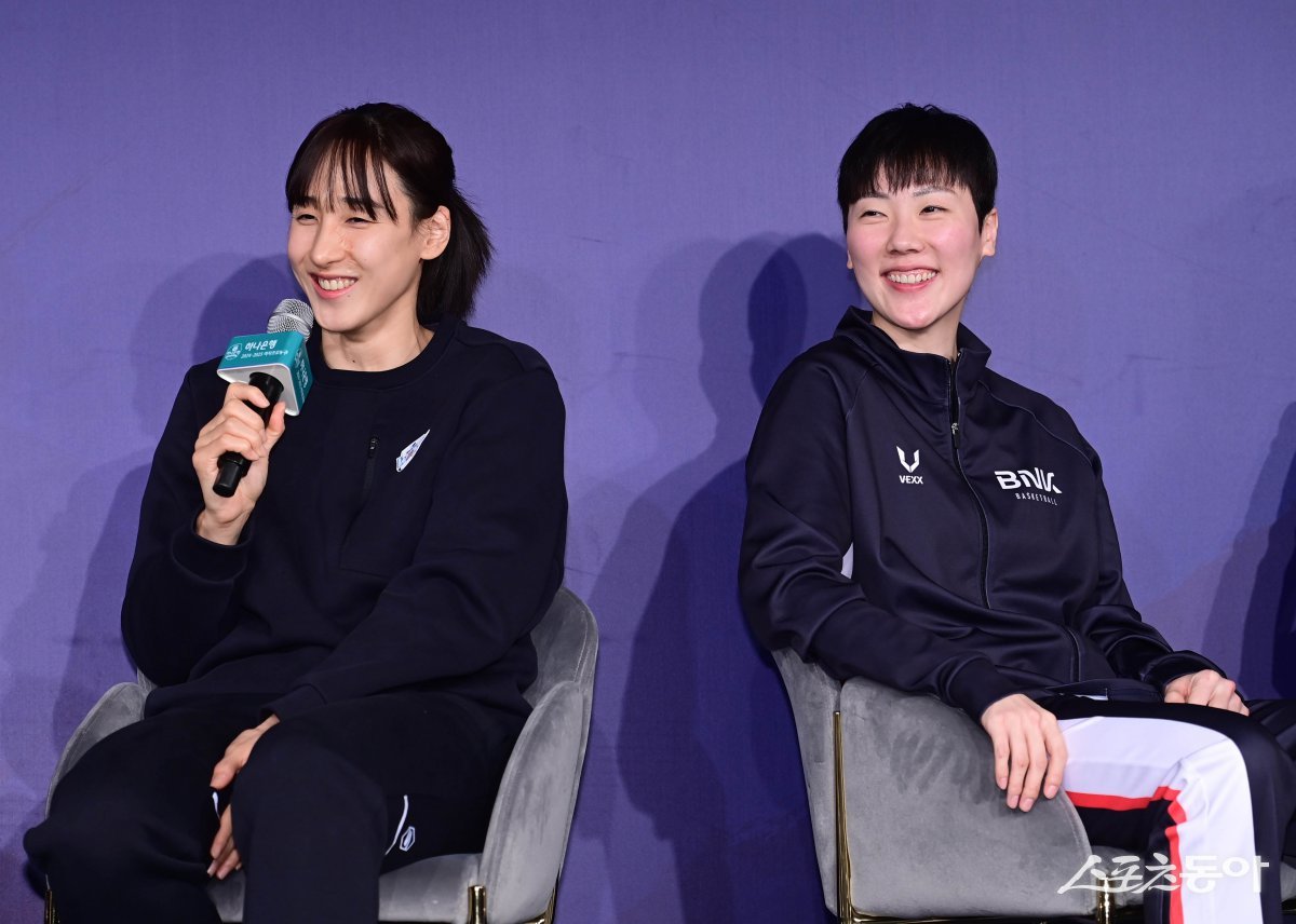 26일 서울 마포구 상암동 스탠포드호텔서울에서 열린 ‘하나은행 2024-2025 여자프로농구 포스트시즌’ 미디어데이에서 우리은행 김단비와 BNK썸 박혜진이 질문에 답하고 있다. 주현희 기자 teth1147@donga.com