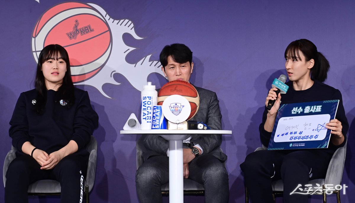 26일 서울 마포구 상암동 스탠포드호텔서울에서 열린 ‘하나은행 2024-2025 여자프로농구 포스트시즌’ 미디어데이에서 우리은행 김단비가 출사표를 말하고 있다. 주현희 기자 teth1147@donga.com