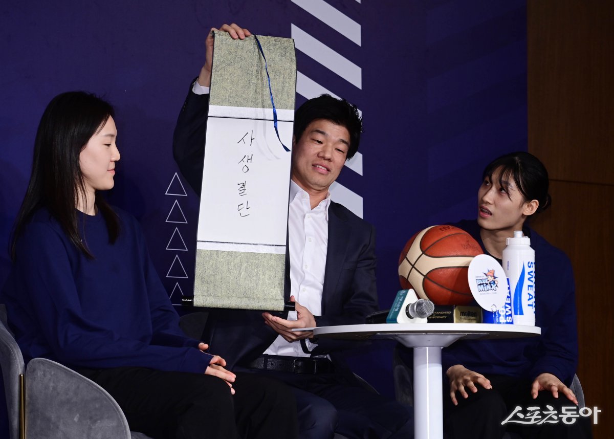 26일 서울 마포구 상암동 스탠포드호텔서울에서 열린 ‘하나은행 2024-2025 여자프로농구 포스트시즌’ 미디어데이에서 삼성생명 하상윤 감독이 출사표를 공개하고 있다. 주현희 기자 teth1147@donga.com