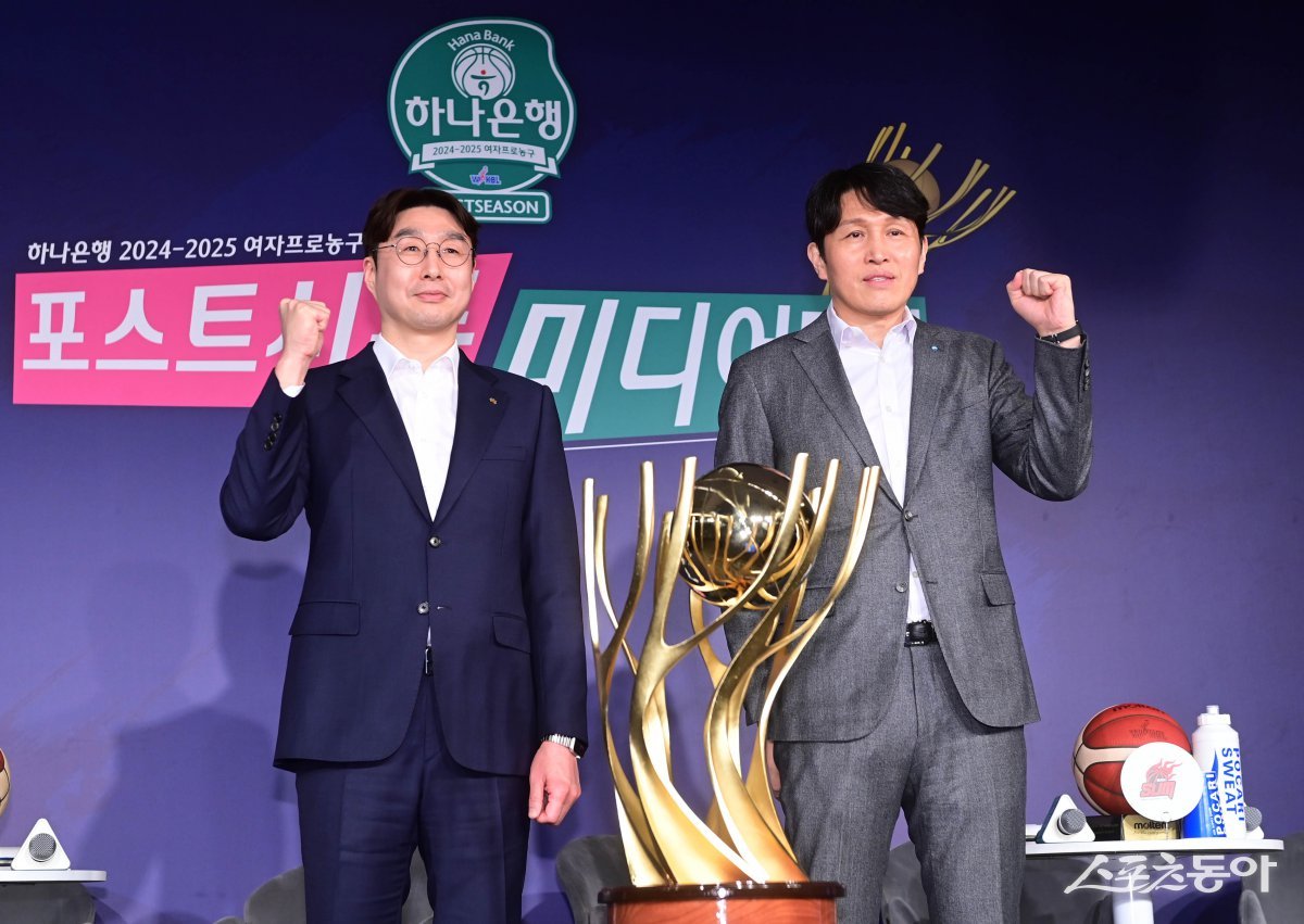 26일 서울 마포구 상암동 스탠포드호텔서울에서 열린 ‘하나은행 2024-2025 여자프로농구 포스트시즌’ 미디어데이에서 KB스타즈 김완수 감독과 우리은행 위성우 감독이 포즈를 취하고 있다. 주현희 기자 teth1147@donga.com