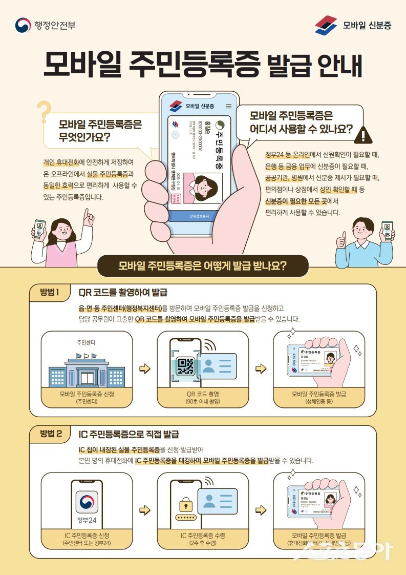 발급 방식은 QR코드를 통한 방식과 IC 주민등록증을 통한 발급 2가지가 있으며 발급 전 스마트폰에 ‘대한민국 모바일 신분증을 앱’을 설치 해야 한다.