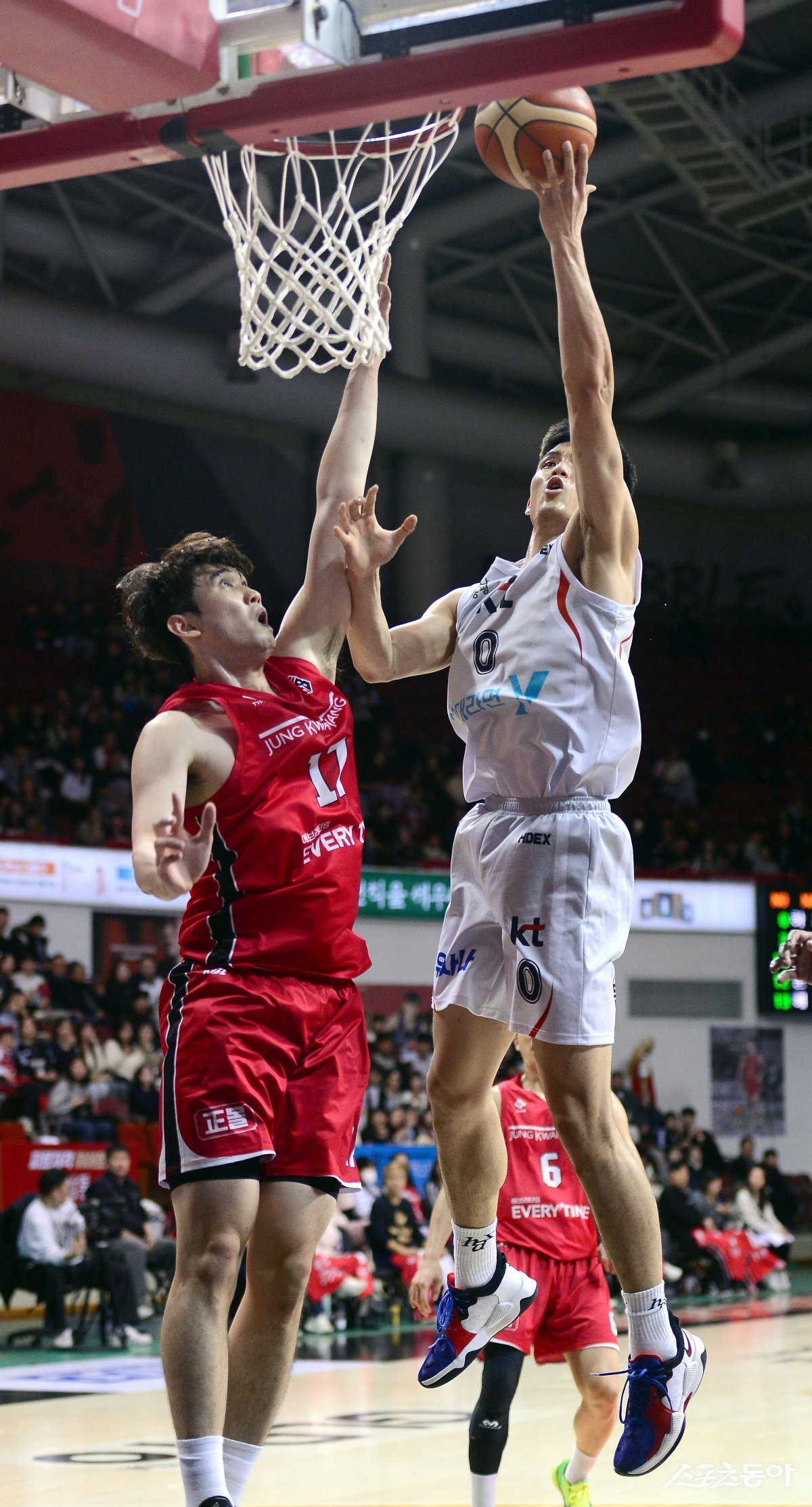 KT 하윤기(오른쪽)가 6일 안양정관장아레나에서 열린 정관장과 원정경기 도중 골밑 공격을 시도하고 있다. 전·후반 극과 극의 경기력을 보인 KT가 정관장에 역전승을 거뒀다. 안양|김종원 기자 won@donga.com