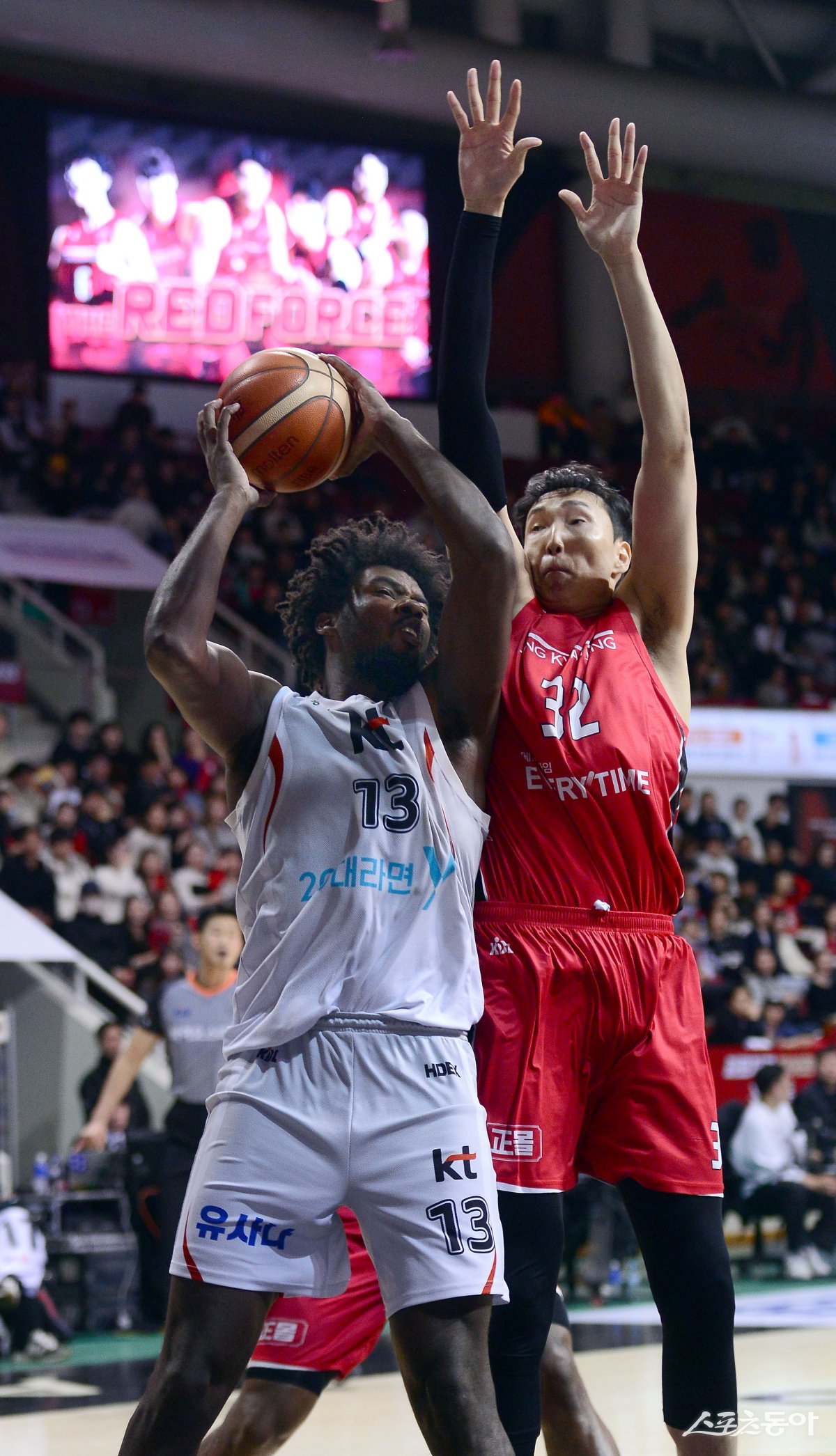 26일 안양 정관장 아레나에서 열린 ‘2024-2025 프로농구’ 정관장과 KT 경기에서 KT 해먼즈가 정관장의 수비를 뚫고 골밑 슛을 하고 있다. 안양|김종원 기자 won@donga.com
