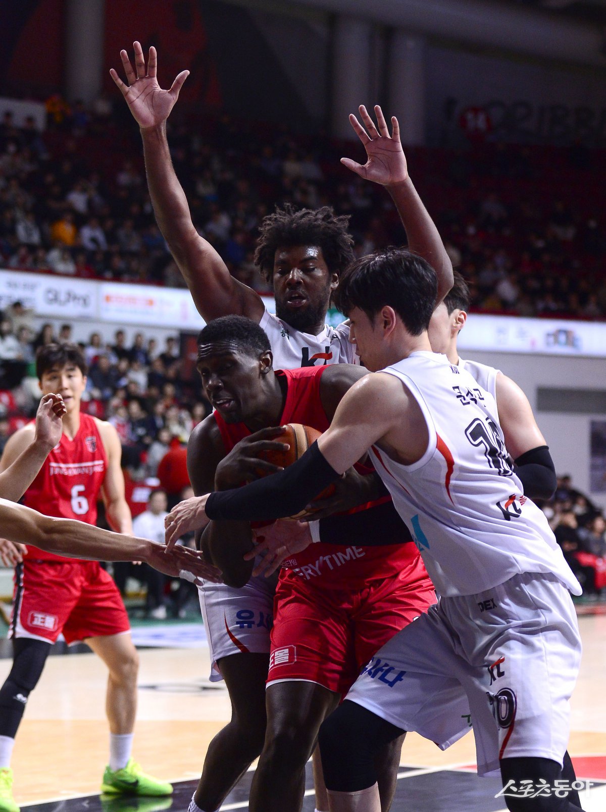 26일 안양 정관장 아레나에서 열린 ‘2024-2025 프로농구’ 정관장과 KT 경기에서 정관장 오브라이언트가 리바운드 볼을 잡고 있다. 안양|김종원 기자 won@donga.com