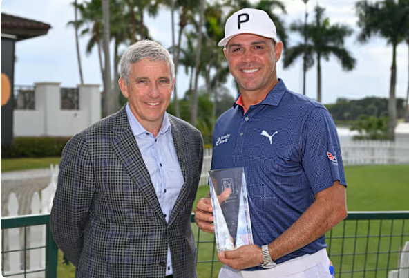 뇌 종양 제거 수술을 받은 뒤 필드에 복귀한 게리 우들랜드(오른쪽)이 27일(한국시간) PGA 투어 용기상을 수상한 뒤 제이 모너핸 커미셔너와 포즈를 취하고 있다. 사진출처 | PGA 홈페이지