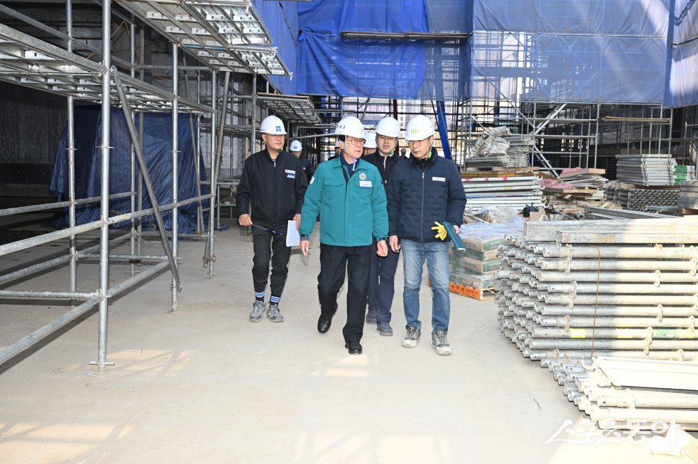 정 군수는 현장에서 공사장 내 철골보 내화피복, 단열재 설치 등 내부 마감공사 진행 상황을 점검하고, 소화기 및 화재감시자 배치, 작업발판의 안전난간대, 추락방호망 설치 및 근로자 안전모·안전대 착용 등 안전사고 예방 조치상황을 면밀히 확인했다.