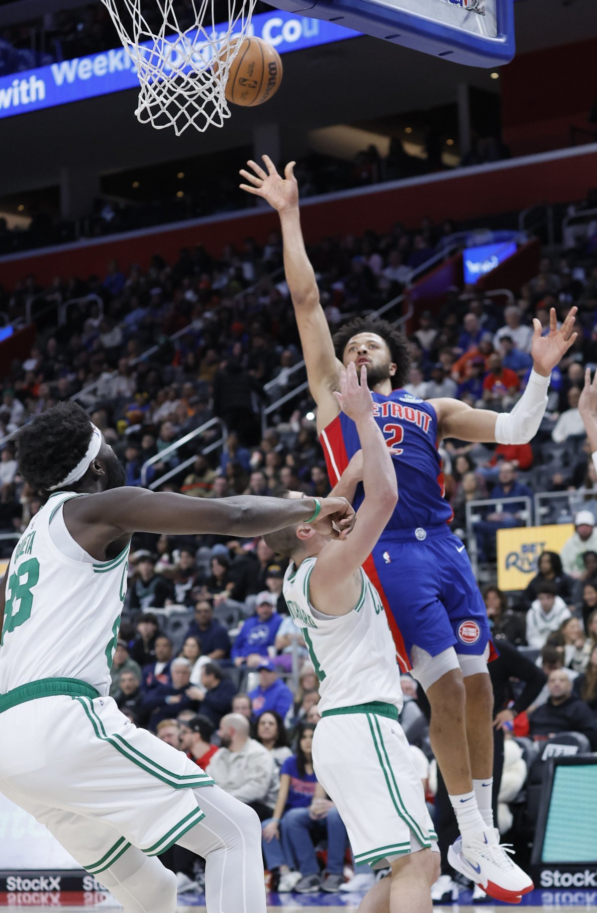 디트로이트는 백투백 경기의 여파로 제일런 브라운이 결장한 보스턴을 상대로 시종일관 우세한 경기를 펼쳤다. 커닝햄과 비즐리가 나란히 8점씩을 뽑은 1쿼터를 29-20으로 마친 디트로이트는 2쿼터 들어 맹추격을 허용해 52-52 동점으로 하프타임을 맞았다.