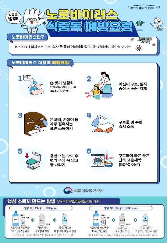또한, 위생점검 시 식중독 예방 자율점검표와 식중독 예방수칙 및 노로바이러스 예방법 등에 대한 홍보물을 배부해 식중독 사전 예방을 위한 지도·홍보도 병행할 계획이다.