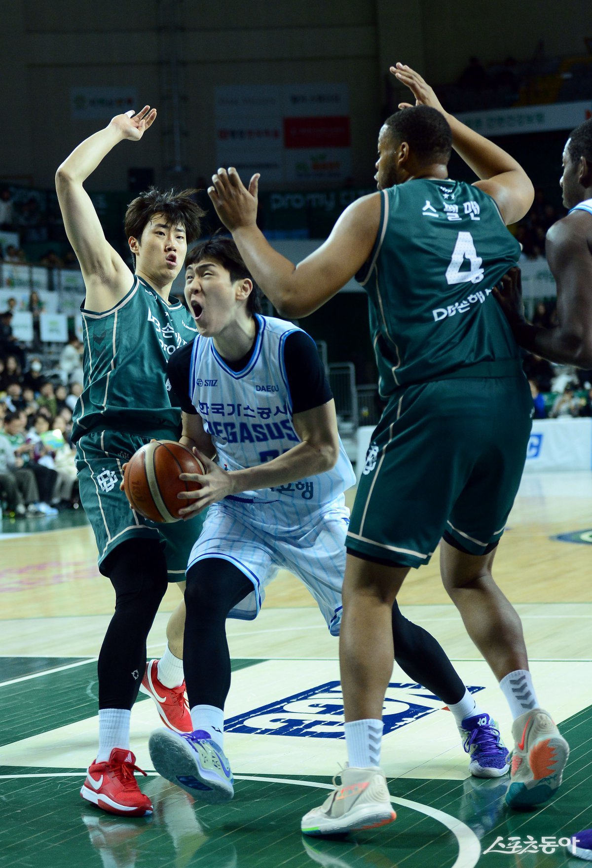 27일 원주종합체육관에서 열린 ‘2024-2025 프로농구’ DB와 한국가스공사 경기에서 한국가스공사 김준일이 DB의 수비를 뚫고 골밑을 공격하고 있다. 원주|김종원 기자 won@donga.com
