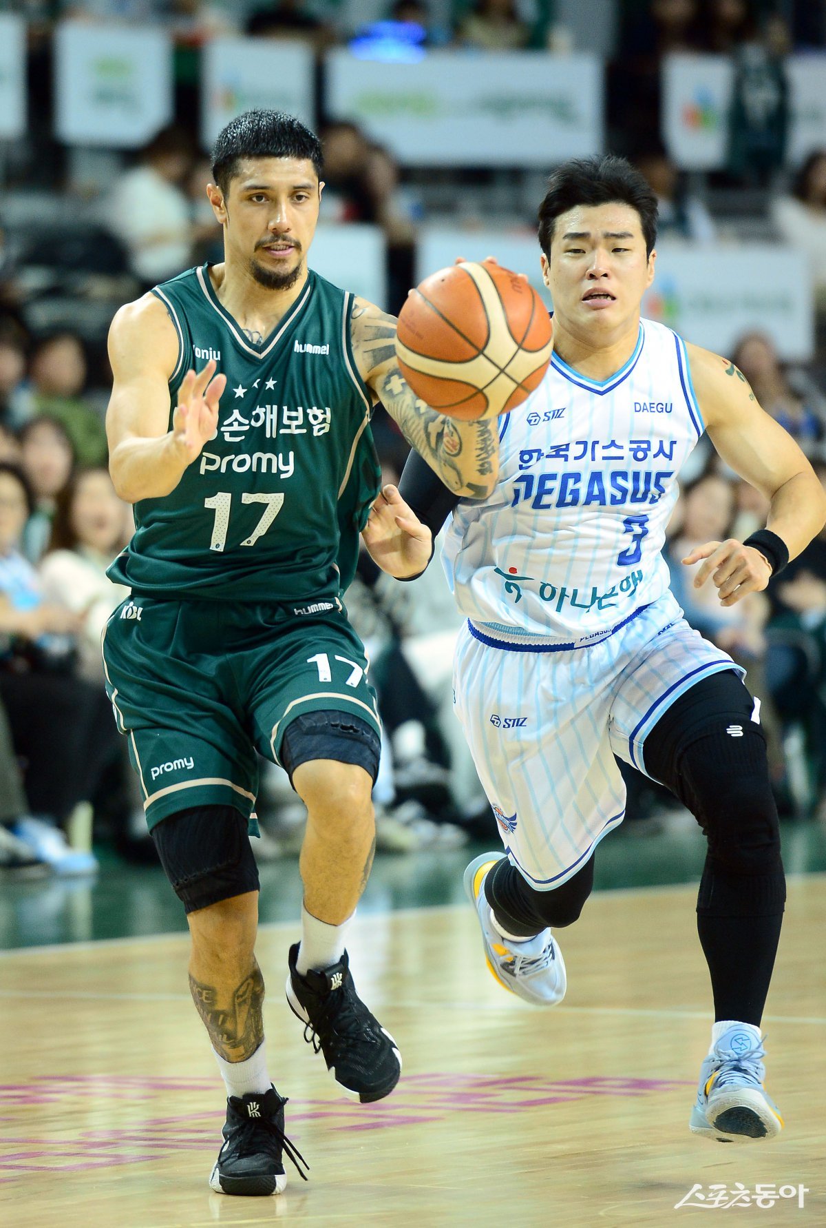 27일 원주종합체육관에서 열린 ‘2024-2025 프로농구’ DB와 한국가스공사 경기에서 DB 알바노가 한국가스공사의 수비를 뚫고 골밑을 공격하고 있다. 원주|김종원 기자 won@donga.com