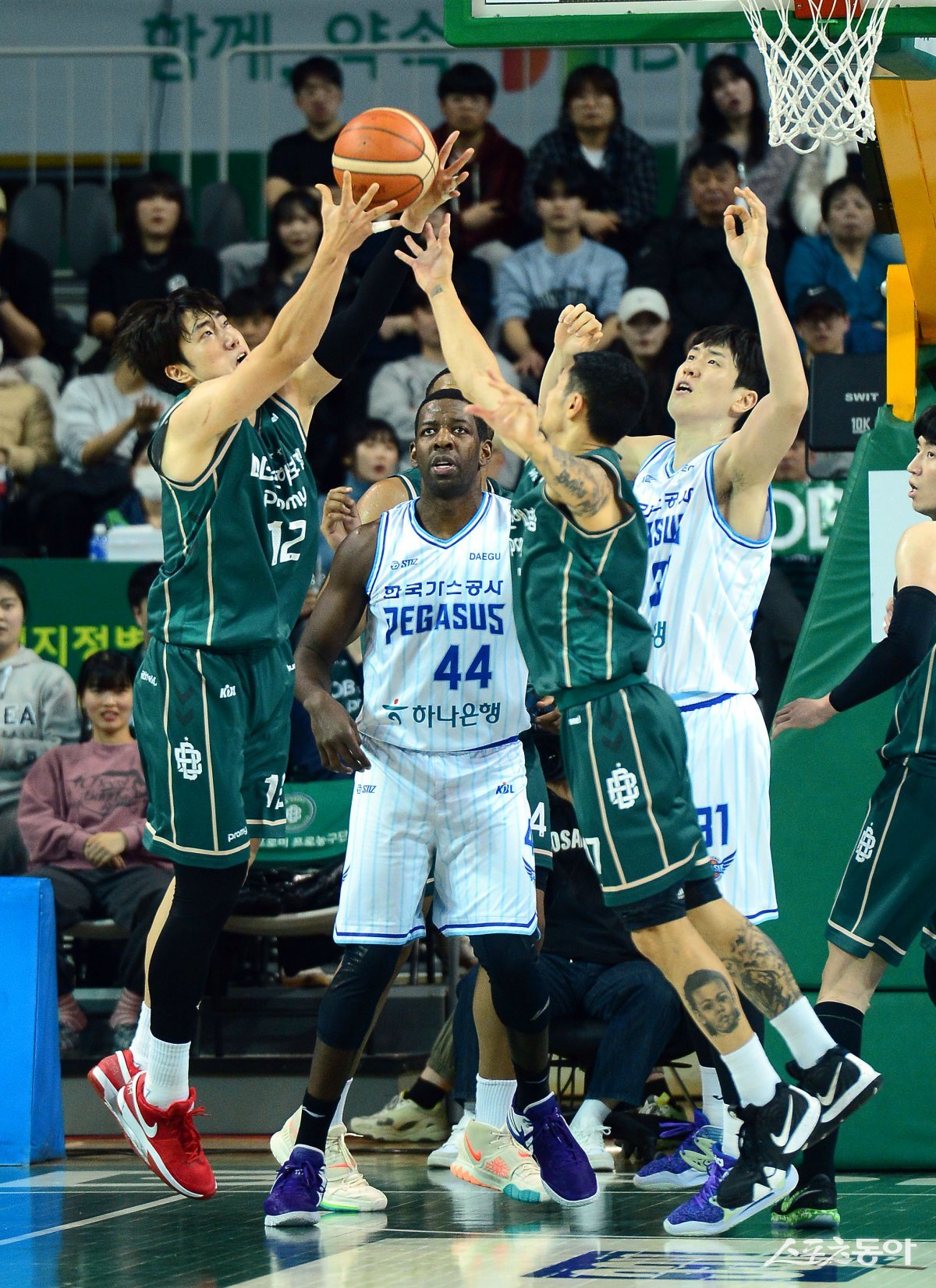 27일 원주종합체육관에서 열린 ‘2024-2025 프로농구’ DB와 한국가스공사 경기에서 DB 정효근이 리바운드 볼을 잡고 있다. 원주|김종원 기자 won@donga.com