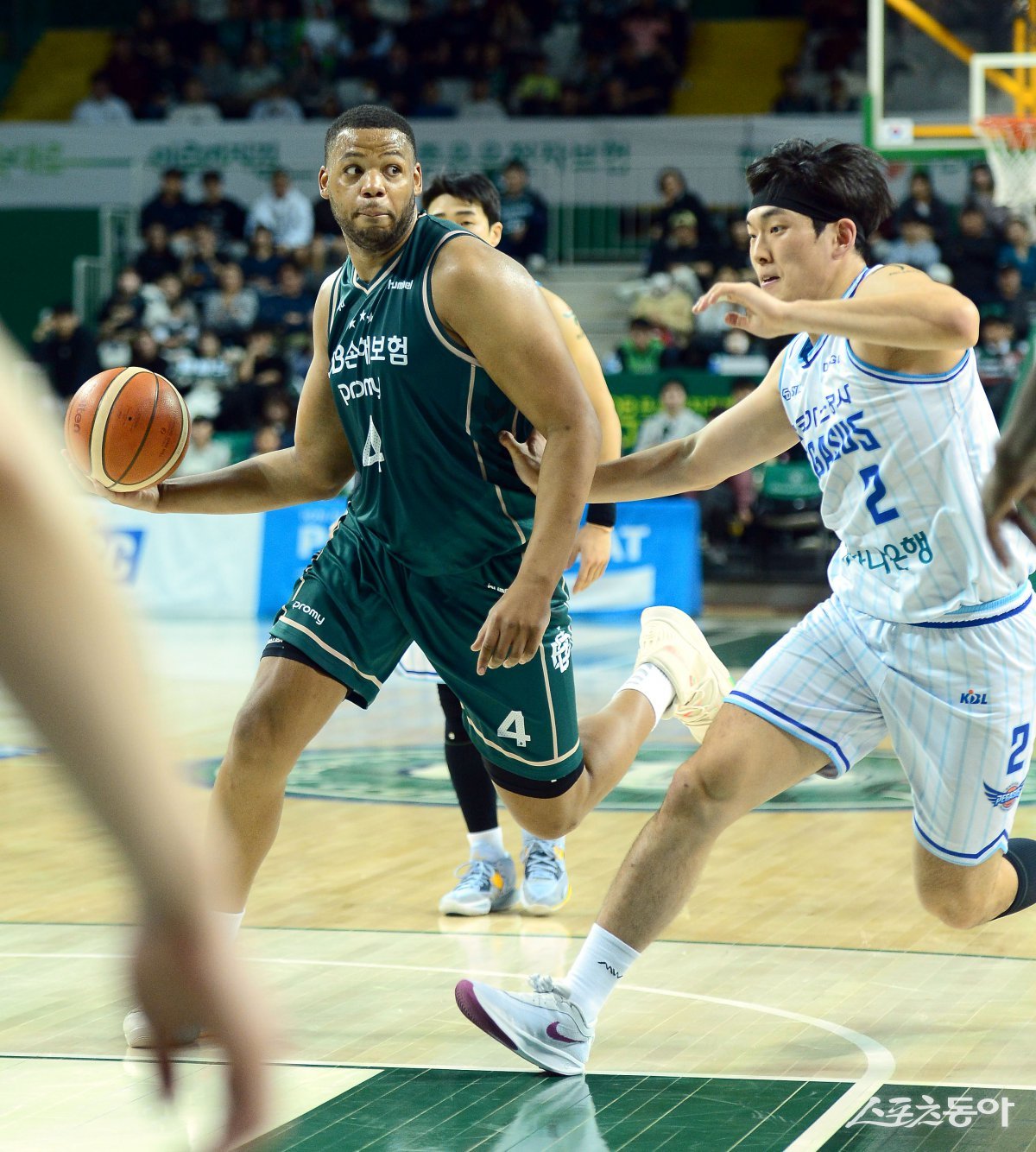 27일 원주종합체육관에서 열린 ‘2024-2025 프로농구’ DB와 한국가스공사 경기에서 DB 스펠맨이 한국가스공사의 수비를 뚫고 골밑을 공격하고 있다. 원주|김종원 기자 won@donga.com