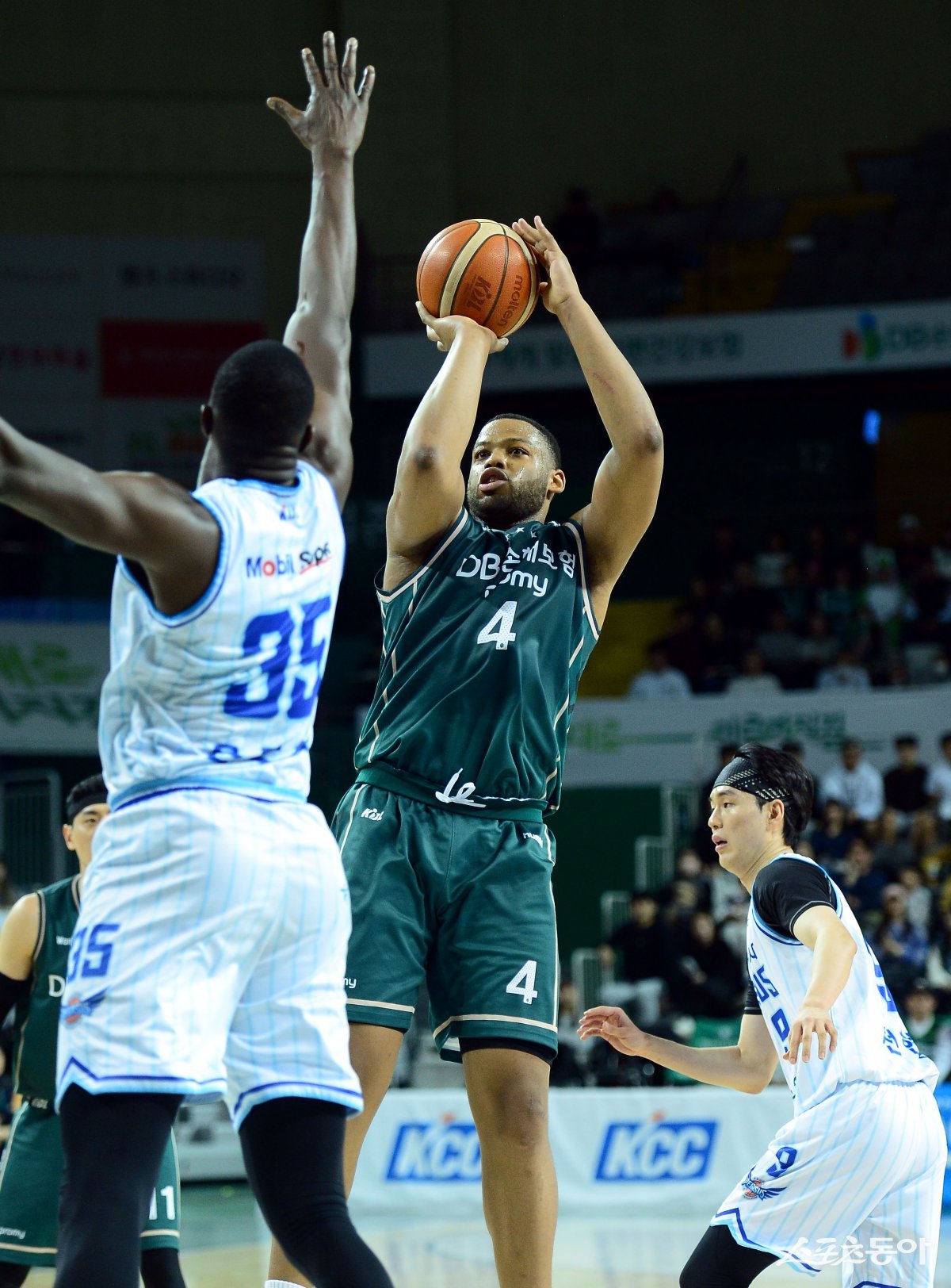 27일 원주종합체육관에서 열린 ‘2024-2025 프로농구’ DB와 한국가스공사 경기에서 DB 스펠맨이 중거리슛을 하고 있다. 원주|김종원 기자 won@donga.com