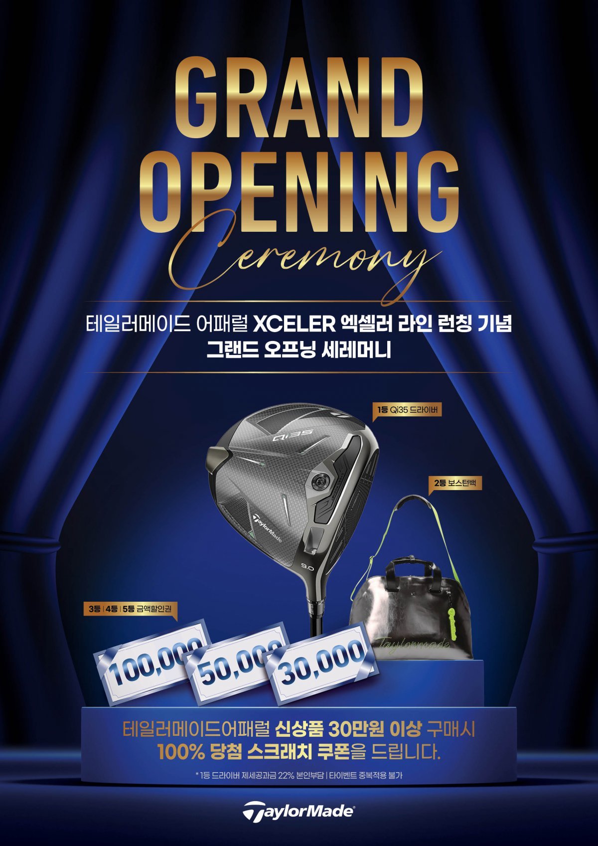 강력한 퍼포먼스를 위한 시그니처 라인 ‘엑셀러’ 출시를 기념해 기획했다. 오프라인 매장 및 자사몰에서 신상품 30만 원 이상 구매 시 100% 당첨 스크래치 쿠폰을 제공한다. 경품으로 1등과 2등에게 각각 테일러메이드 Qi35 드라이버와 보스턴백을 증정한다. 3, 4, 5등에게 각각 금액별 할인권 10만 원, 5만 원, 3만 원을 준다.