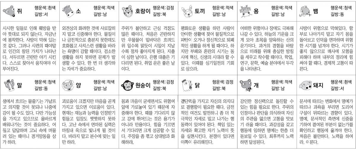 쥐띠 : 시시한일들로인해훼방을받아뜻대로되지않는다.자금난에봉착한다.사방이막혀있는것같다.그러나시련의때야말로인간의참된가치가나타난다.서두르면곤란만야기시킨다.스스로찾아서움직여야이루어진다.