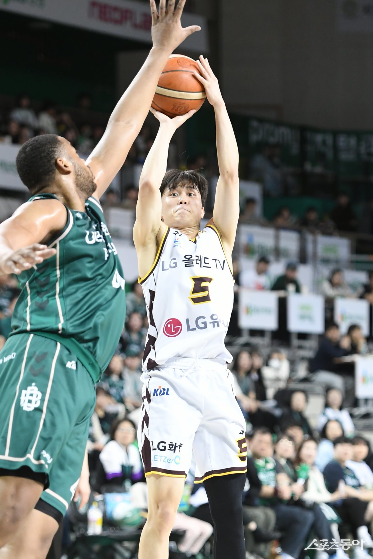 LG 양준석(오른쪽)이 3일 열린 DB와 원정경기 도중 3점슛을 시도하고 있다. 양준석은 이날 무득점에 그치는 등 최근 주춤하고 있다. 사진제공|KBL