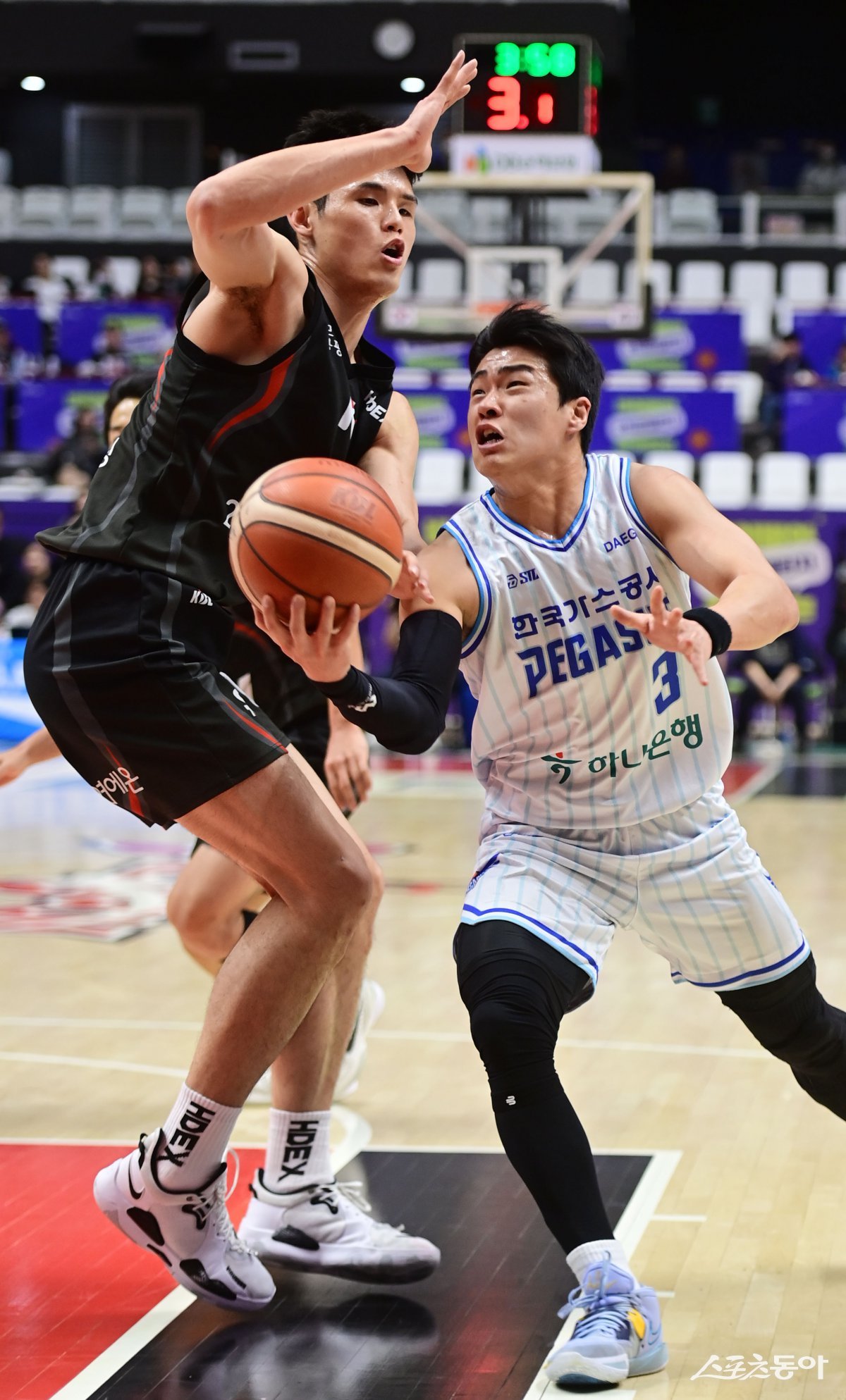 4일 수원KT소닉붐아레나에서 열린 ‘2024-2025 KCC 프로농구’ KT와 한국가스공사의 경기에서 한국가스공사 정성우가 KT 하윤기의 수비를 뚫고 슛을 하고 있다. 수원 | 주현희 기자 teth1147@donga.com
