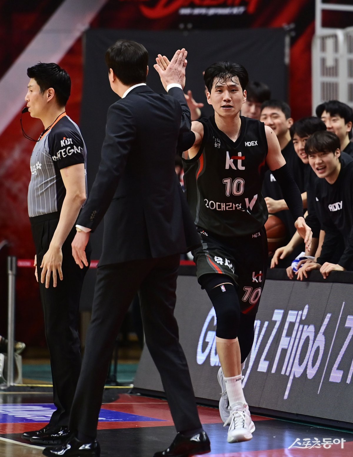 4일 수원KT소닉붐아레나에서 열린 ‘2024-2025 KCC 프로농구’ KT와 한국가스공사의 경기에서 3점슛을 성공시킨 KT 문성곤이 감독과 하이파이브를 하고 있다. 수원 | 주현희 기자 teth1147@donga.com