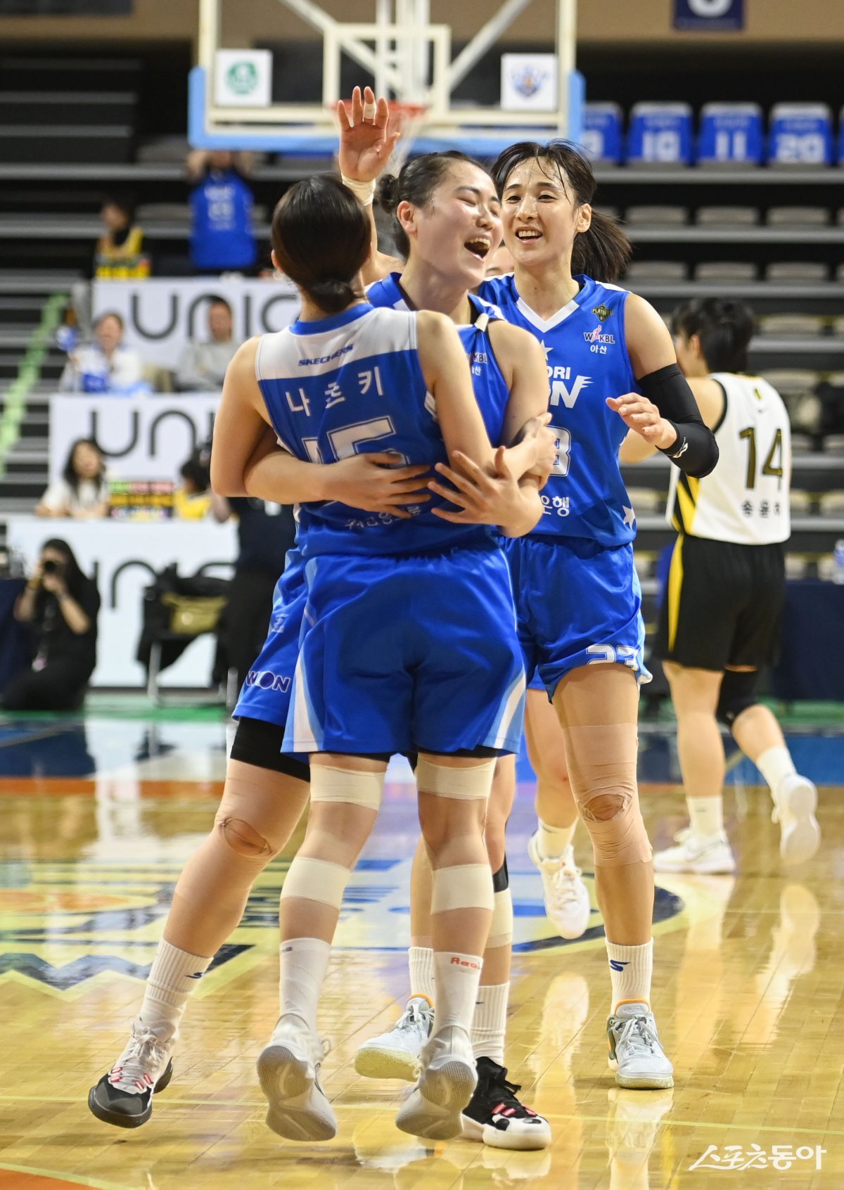 4일 아산 이순신체육관에서 열린 ‘하나은행 2024~25 여자프로농구’ 4강 플레이오프 2차전 우리은행과 KB스타즈 경기에서 2쿼터 종료 직전 우리은행 나츠키가 3점슛을 성공시키자 김단비가 기뻐하고 있다. 아산 | 김종원 기자 won@donga.com