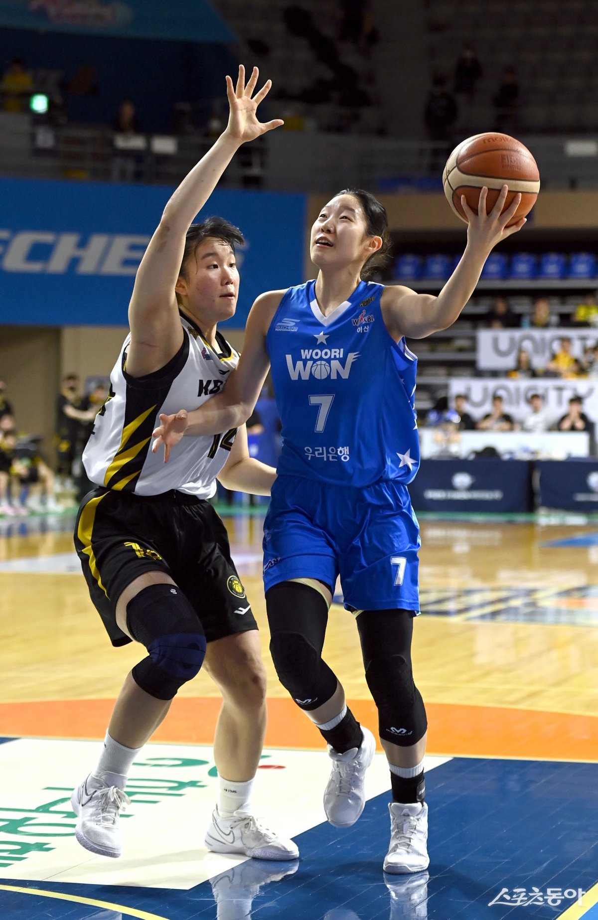 4일 아산 이순신체육관에서 열린 ‘하나은행 2024~25 여자프로농구’ 4강 플레이오프 2차전 우리은행과 KB스타즈 경기에서 우리은행 이민지가 KB스타즈의 수비를 뚫고 골밑 슛을 하고 있다. 아산 | 김종원 기자 won@donga.com