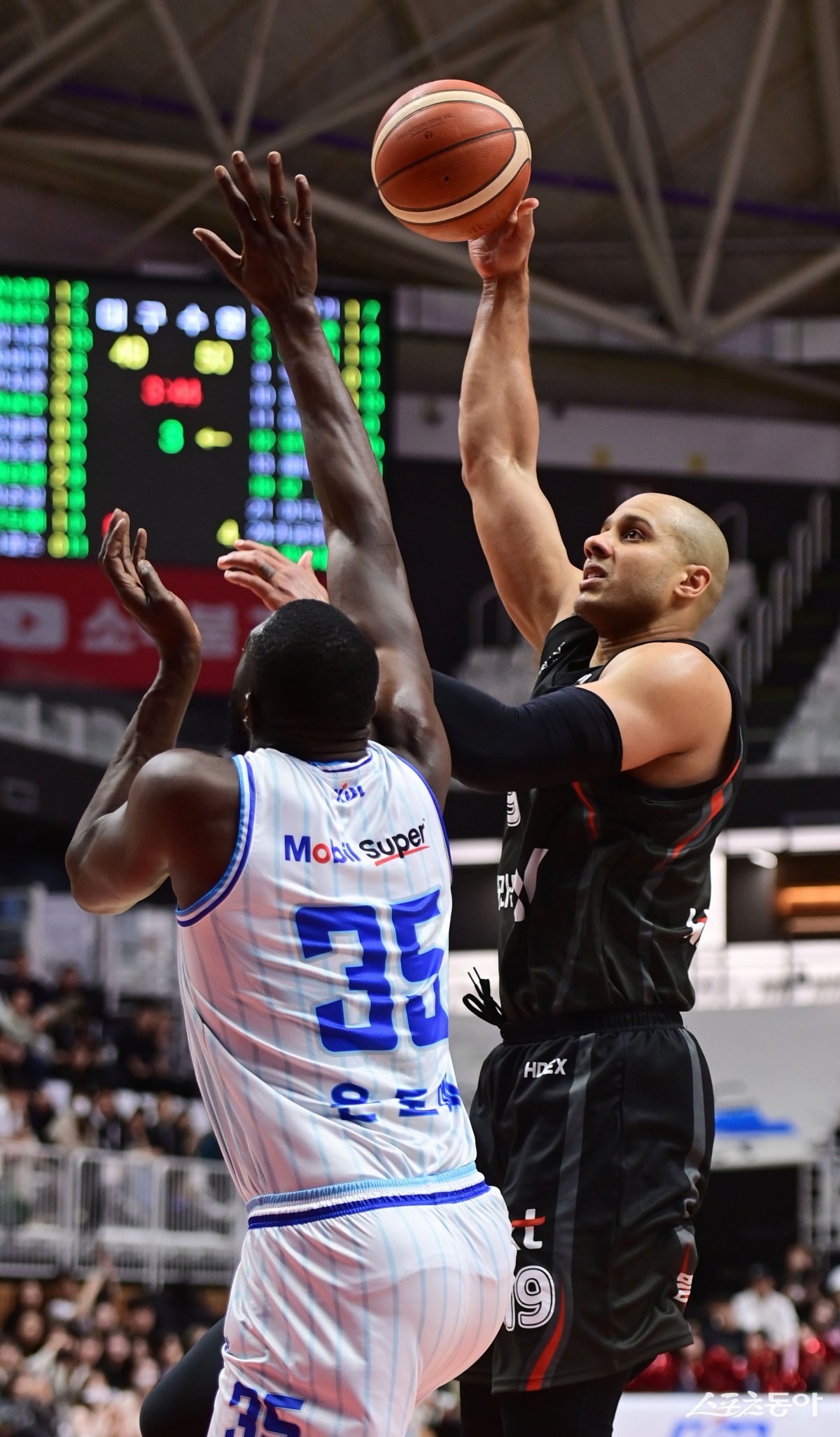 4일 수원KT소닉붐아레나에서 열린 ‘2024-2025 KCC 프로농구’ KT와 한국가스공사의 경기에서 KT 모건이 한국가스공사 수비 앞에서 슛을 하고 있다. 수원 | 주현희 기자 teth1147@donga.com