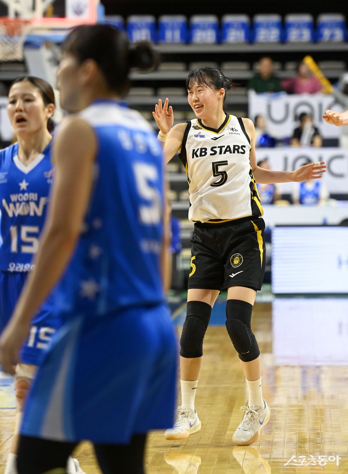 4일 아산 이순신체육관에서 열린 ‘하나은행 2024~25 여자프로농구’ 4강 플레이오프 2차전 우리은행과 KB스타즈 경기에서 KB스타즈 양지수가 1점 차 추격하는 3점슛을 성공시킨 후 기뻐하고 있다. 아산 | 김종원 기자 won@donga.com