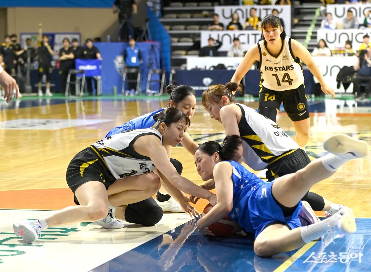 4일 아산 이순신체육관에서 열린 ‘하나은행 2024~25 여자프로농구’ 4강 플레이오프 2차전 우리은행과 KB스타즈 경기에서 KB스타즈 나가타 모에, 이채은과 우리은행 한엄지가 루즈볼을 다투고 있다. 아산 | 김종원 기자 won@donga.com