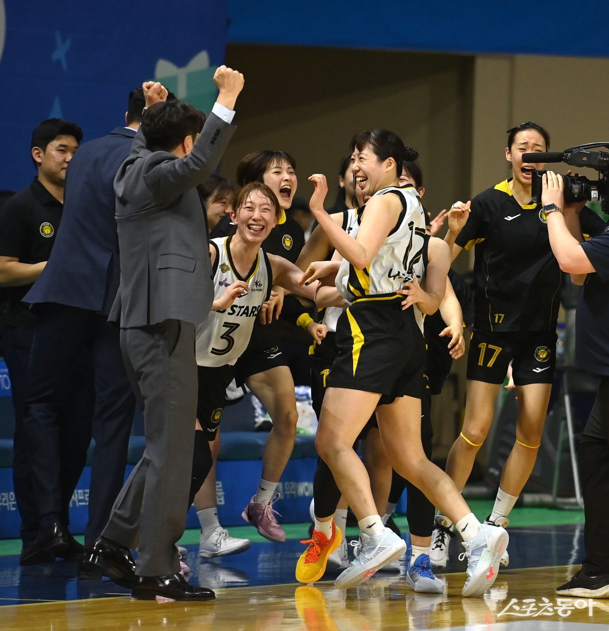 4일 아산 이순신체육관에서 열린 ‘하나은행 2024~25 여자프로농구’ 4강 플레이오프 2차전 우리은행과 KB스타즈 경기에서 58-57 역전승을 거두며 PO 전적 1승 1패를 기록한 KB스타즈 선수들이 기뻐하고 있다. 아산 | 김종원 기자 won@donga.com