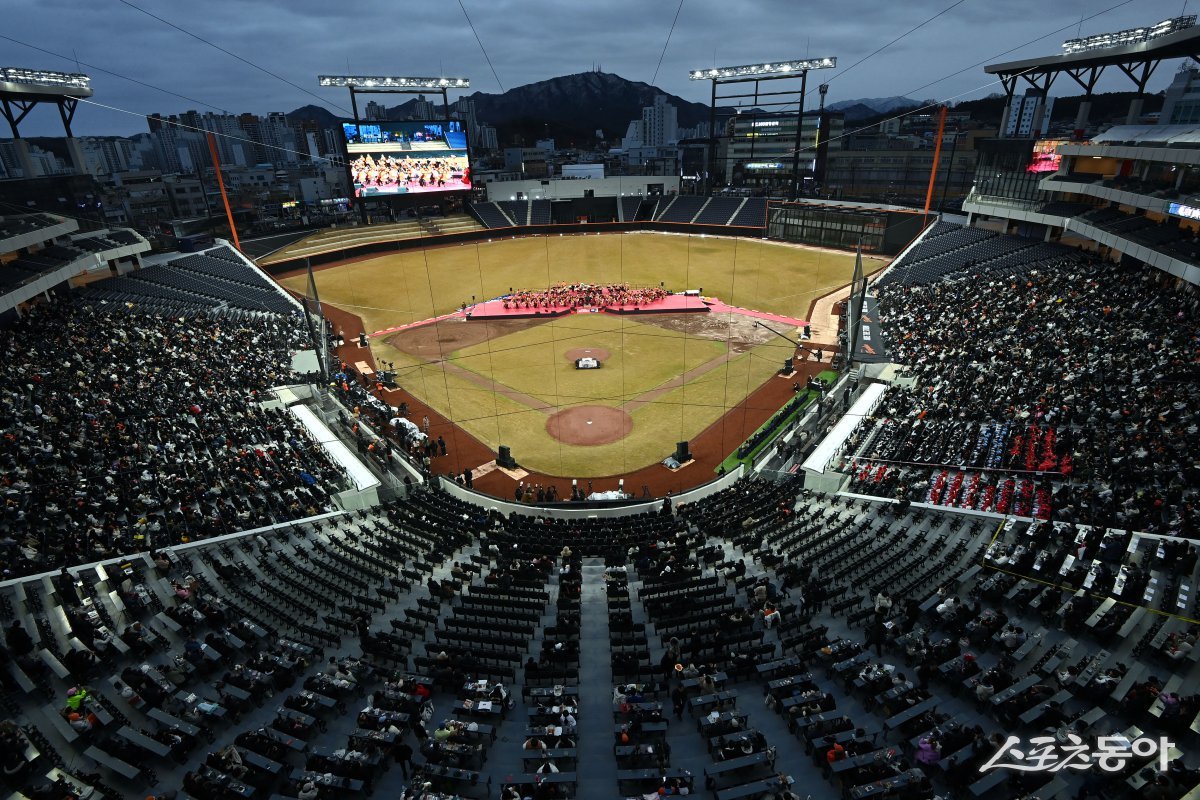 프로야구 한화이글스의 홈구장 ‘대전 한화생명볼파크’가 5일 공식 개장한다. 야구팬들이 내야 관중석을 가득메운 가운데 공식 개장 행사가 진행되고 있다. 대전 | 김민성 기자 marineboy@donga.com