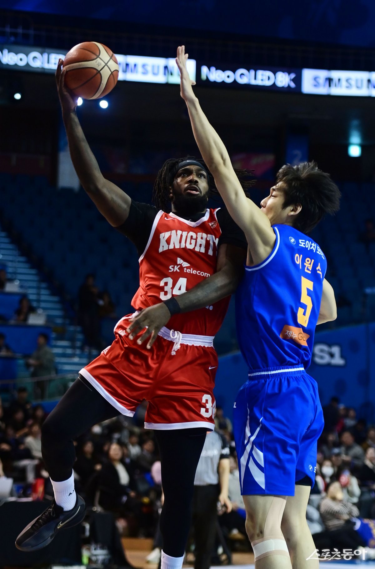 5일 서울 잠실실내체육관에서 열린 ‘2024-2025 KCC 프로농구’ 삼성과 SK의 경기에서 SK 워니가 삼성 이원석 앞에서 슛을 하고 있다. 잠실 | 주현희 기자 teth1147@donga.com