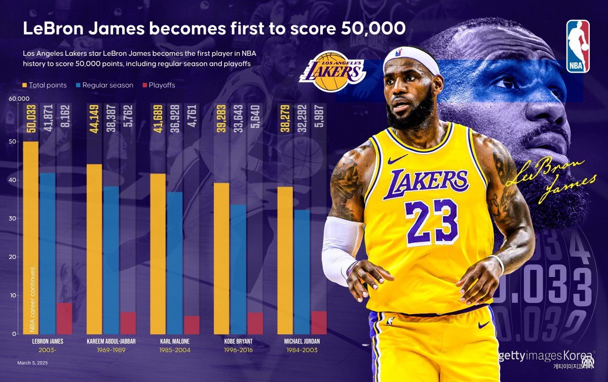 이에 제임스는 직전 경기까지 기록한 4만 9999점에 3점을 더해 5만 2점을 기록했다. 그 누구도 달성하지 못한 도합 5만 점.